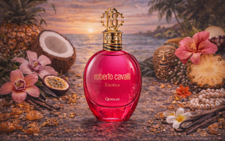 Roberto Cavalli – Exotica Qadın, tropik meyvə şirinliyi ilə açılan, hibiskus və ekzotik çiçəklərlə cazibə quran, bazada isə vanil–müşk yumşaqlığı ilə isti, flörtöz və diqqətçəkən…