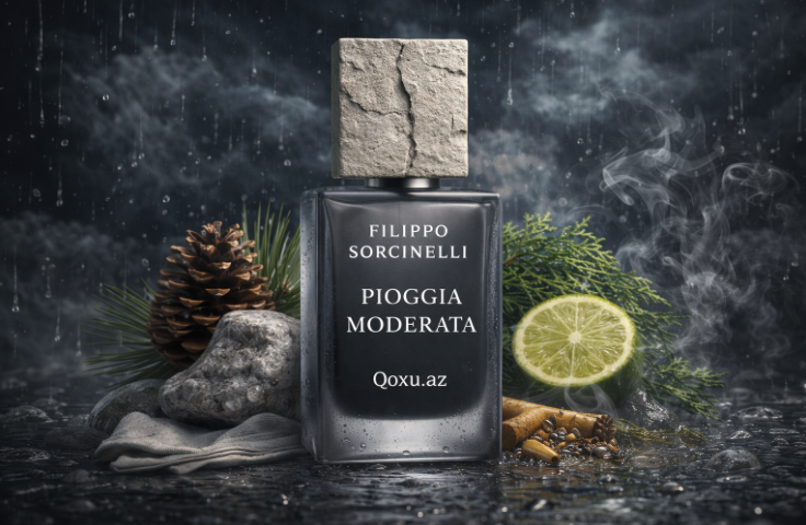 Filippo Sorcinelli – Pioggia Moderata Uniseks ətir, islanmış asfalt, rütubətli odun, torpaq, dəniz notu və iris üzərində qurulan, şəhərdə yağış altında tək gəzinti hissi yaradan…