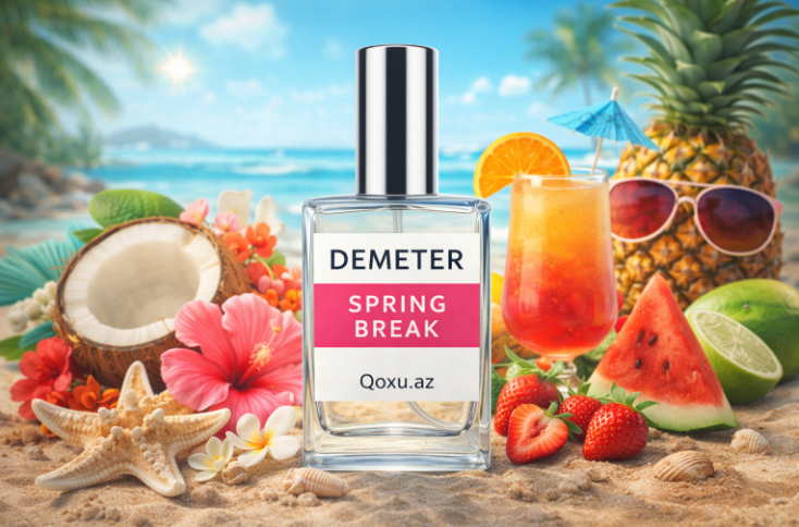 Demeter — Spring Break klassik mənada çoxqatlı, dəyişkən niş parfüm deyil. Bu ətir Demeter-in məşhur yanaşmasına uyğun olaraq bir xatirəni, bir atmosferi və bir həyat anını qoxuya çevirməyə çalışır. Burada məqsəd “mürəkkəb parfümeriya nümayişi” yox, insanı birbaşa çimərlik, günəş kremi, dəniz havası və rahat tətil hissinə aparmaqdır.